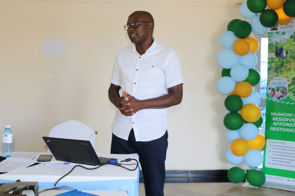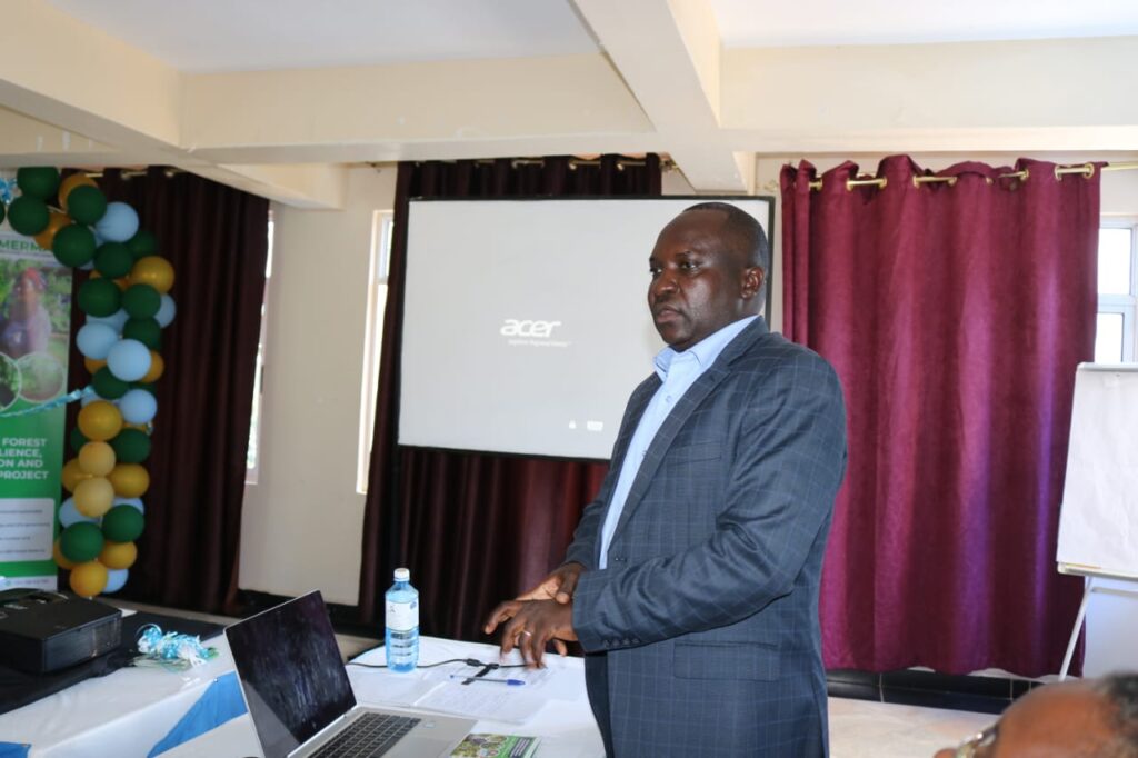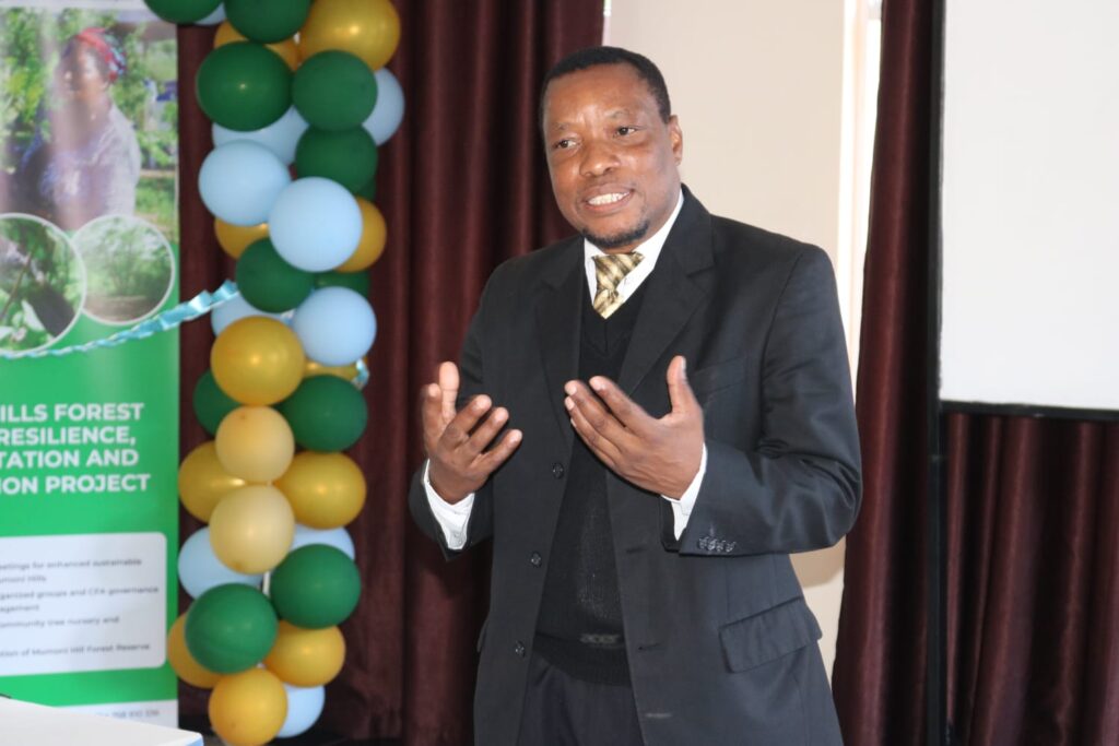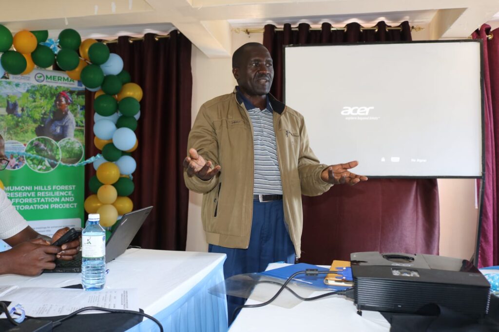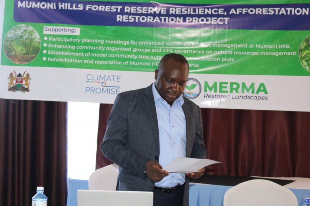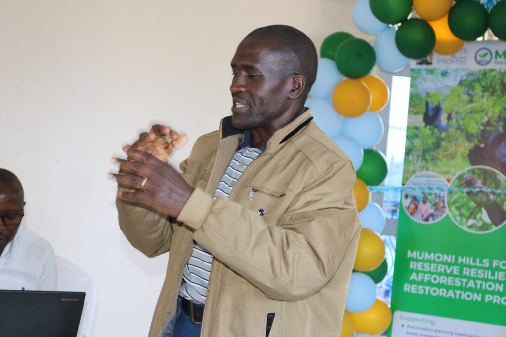 Mr. Charles Kavithi , KFS Kitui County Conservation Coordinator address participants during a participatory planning meeting for Mumoni